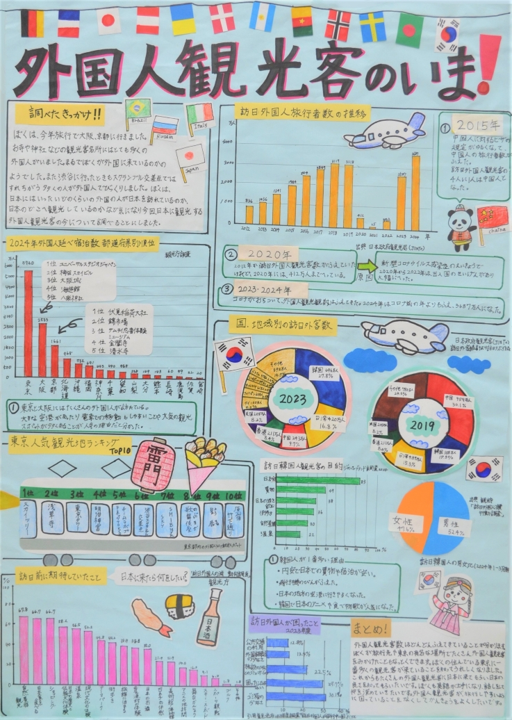 出向いた先での外国人の多さに驚いたことがきっかけとなり、訪日外国人観光客の現状についてまとめた作品です。訪日外国人旅行者について、旅行者数の推移や国・地域別の内訳、宿泊先や目的などを様々なデータから分かりやすくまとめています。また、飛行機や万国旗など、所々で見られるイラストがテーマと内容を引き立てており、説明文も適度な量であり、全体的にバランスがとれた素晴らしい作品です。